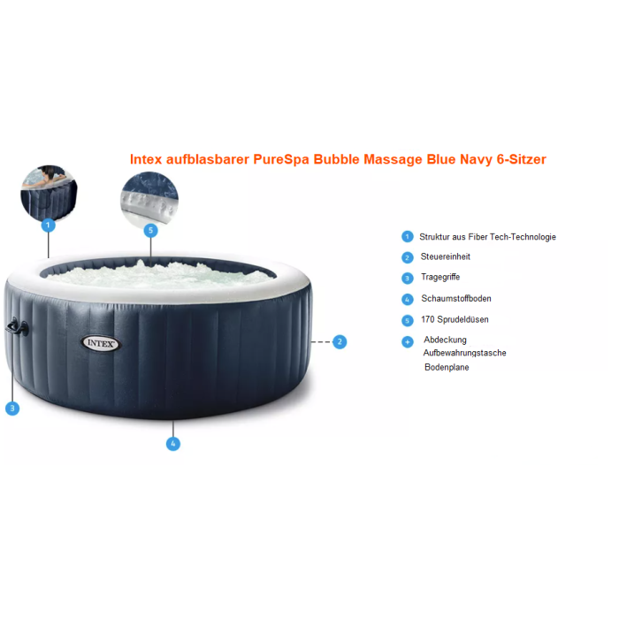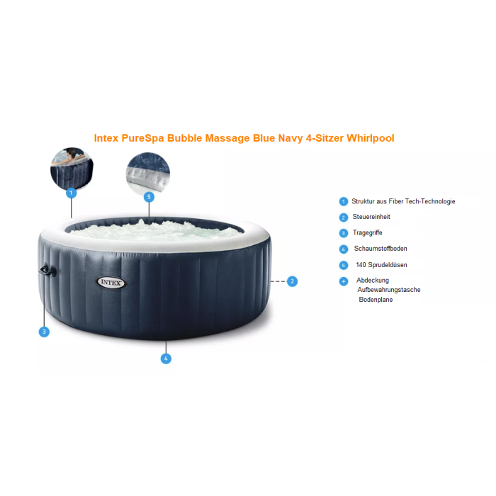 Découvrez ci-contre la vidéo de présentation officielle d’Intex avec . Elle présente le spa gonflable Pure Spa Plus Bulles dans son coloris avant 2018. Il y a peu de différences avec la fiche produit que vous consultez si ce n’est la couleur intérieure de la cuve.